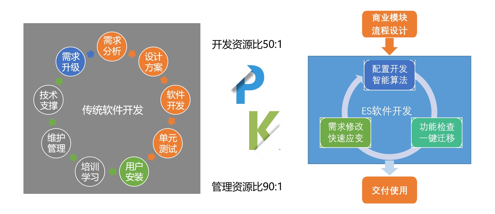 ES软件是面向业务的、开放的低代码快速开放开发与应用平台。即区别于传统的软件开发模式——不用写代码,不用测试。